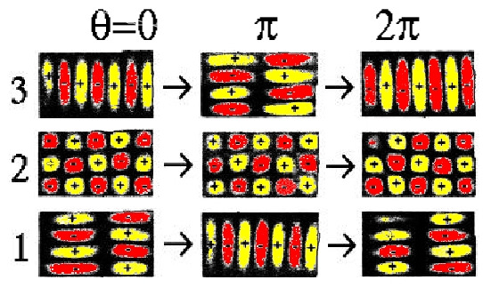 In our figure above, this happens exactly at mid path: the evolution starts from a wave of type {2,4} (i.e. with 2 semi-oscillations in the horizontal direction and 4 in the vertical one). It then undergoes some mixing, to become a {7,1} wave at mid way. Finally it evolves to become again {2,4}, but with the changed sign (its Berry phase discussed above). It is known by elementary Fourier analysis that the waves {2,4} and {7,1} are indeed orthogonal.